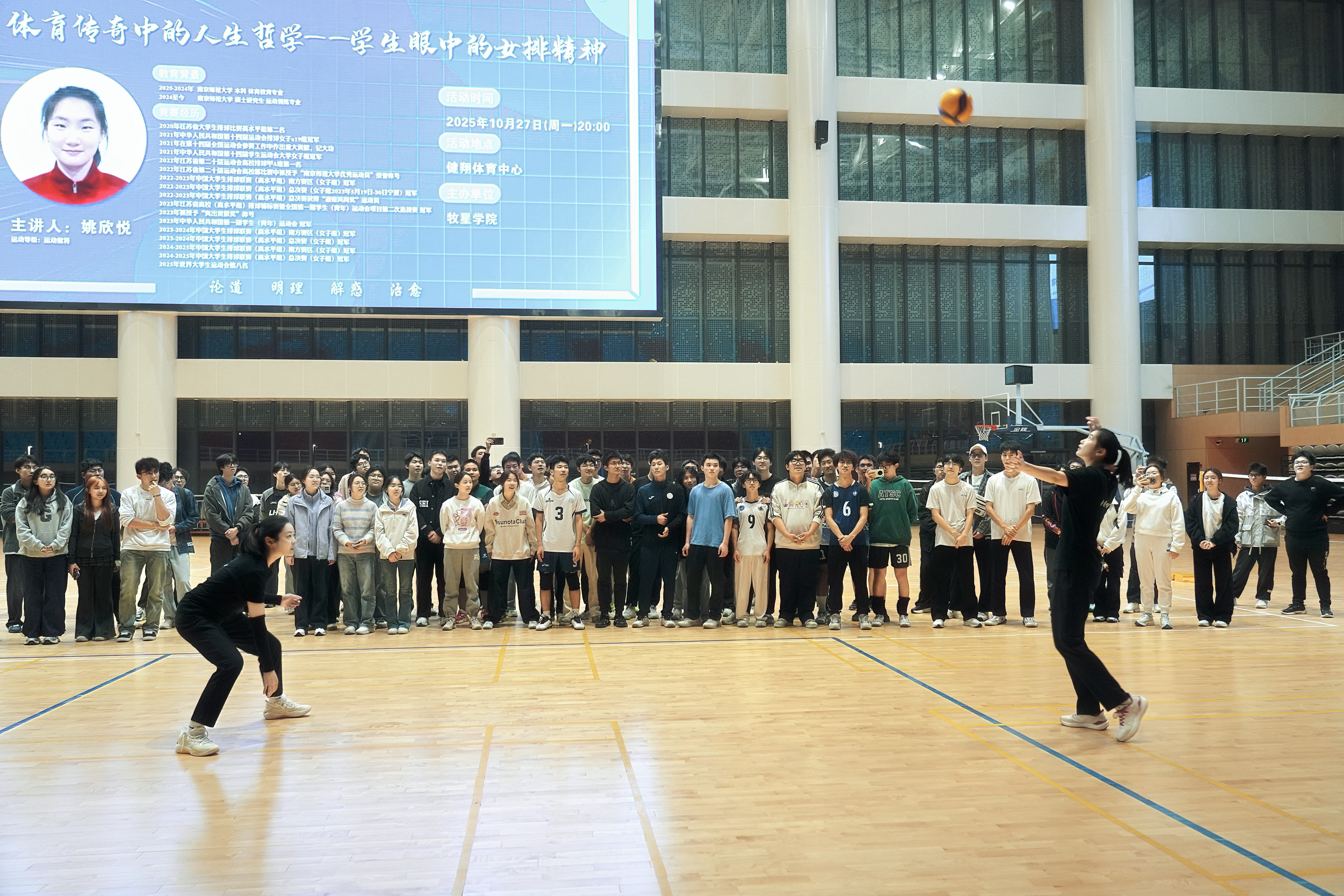 10月27日晚,牧星学院在天目湖校区开展“问致有约·跃动牧星:学生眼中的女排精神”主题活动。本次活动由牧星学院副院长张建辉主讲,特别邀请南京师范大学女排健将姚欣悦、鲍雨檬与校排球队队员及全校100余名排球爱好者齐聚一堂,共赴一场排球与精神的盛宴,深切感受女排精神的磅礴力量。