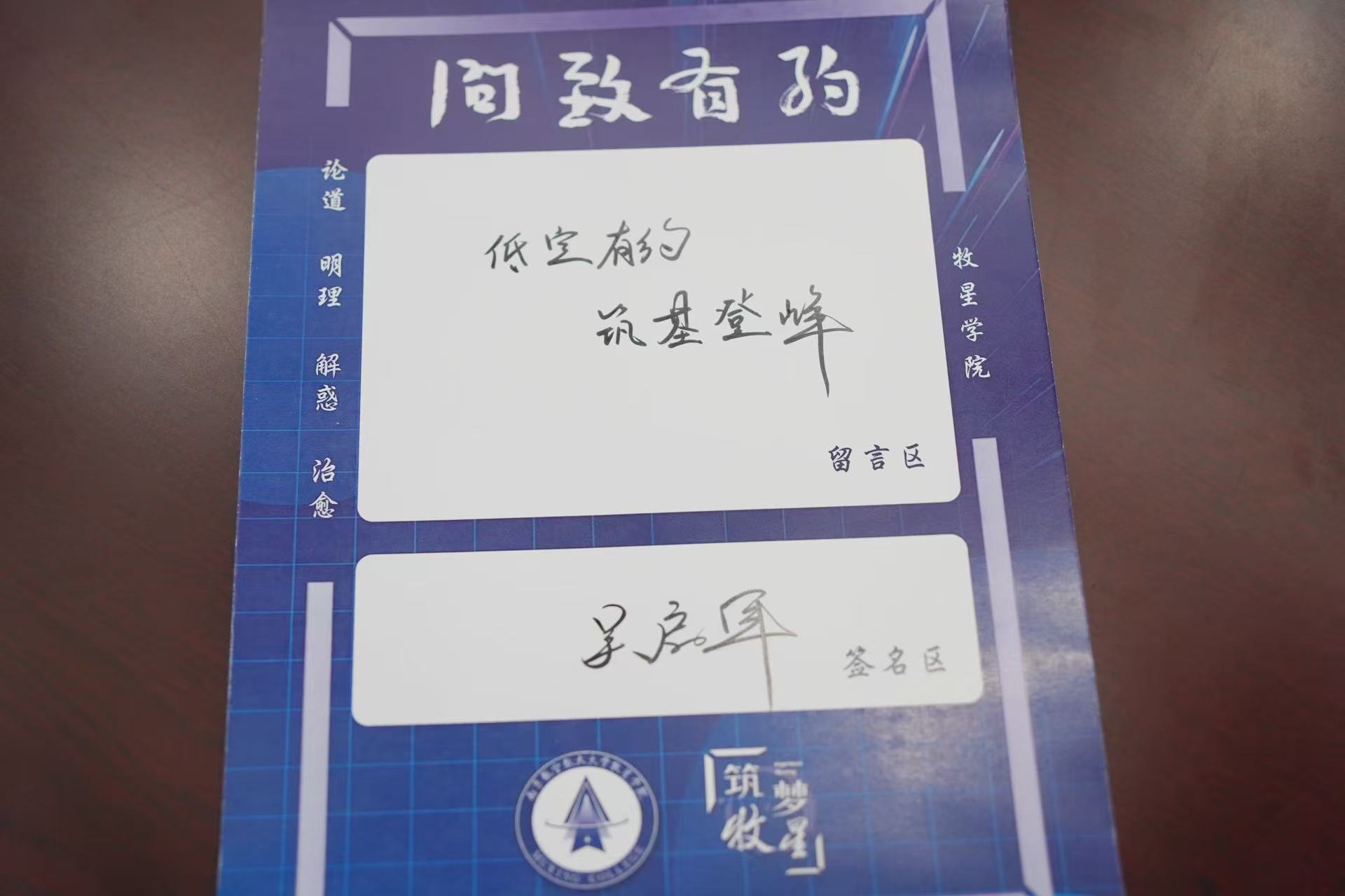 活动尾声,吴启晖在‘问致有约’留言卡上为牧星学子题写寄语“筑基低空,立志巅峰”,勉励大家夯实低空之基,共攀科技高峰,让梦想翱翔于更广阔的天空!